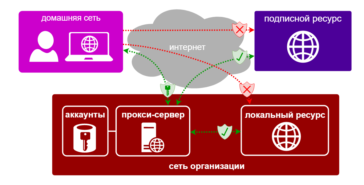 Обычно удалённые ресурсы доступны из сети организации по IP-адресу (просмотр, скачивание, поиск и т.д.) без логина или пароля. Но как к этим ресурсам получить доступ из дома?